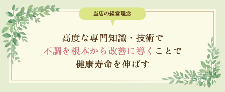 当店では、漢方療法・栄養指導・鍼灸治療や温灸療法によって体の内と外の両面からあなた本来の力を取り戻し、不調を根本から改善し、健康寿命の延伸を図っていきます。