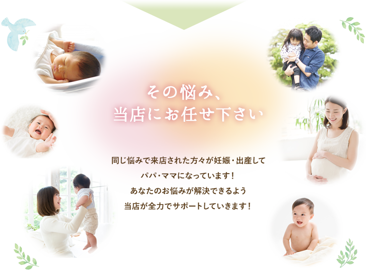当店が所属する一般社団法人婦人科セラピー協会は不妊治療のスペシャリストの集まる団体で、今までの膨大なデータの基、今あなたが妊娠するために何が足りないのかを見つけ出し、最善最良のプランをご提案させて頂きます。