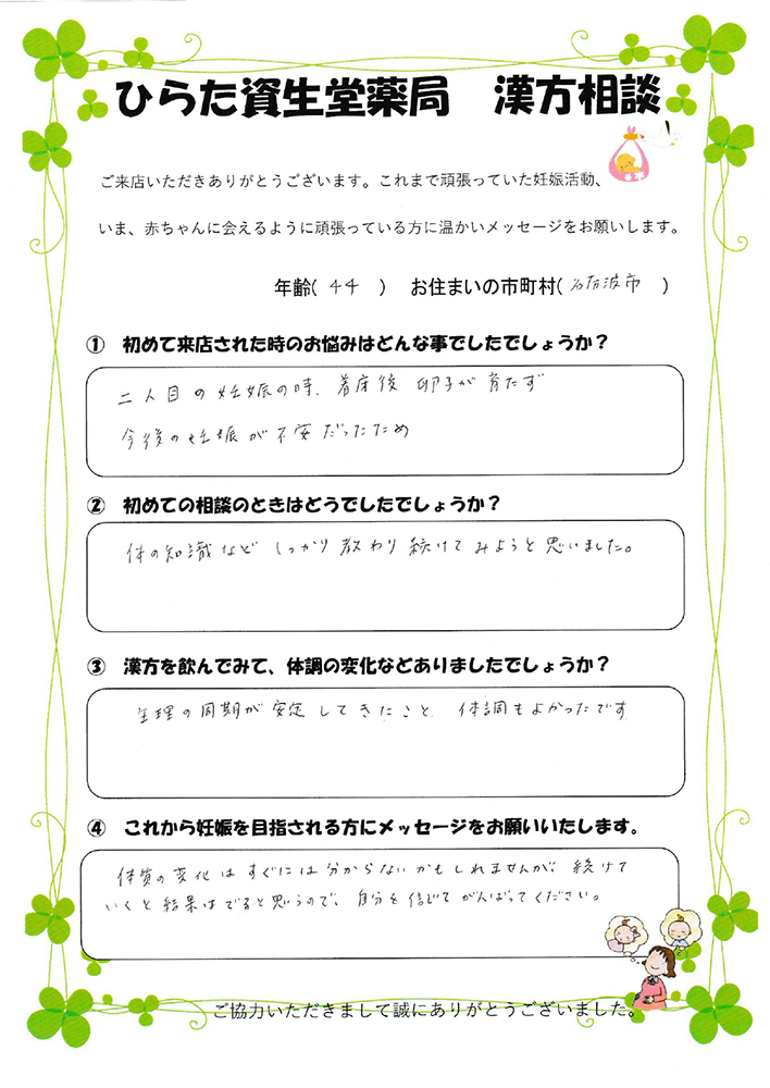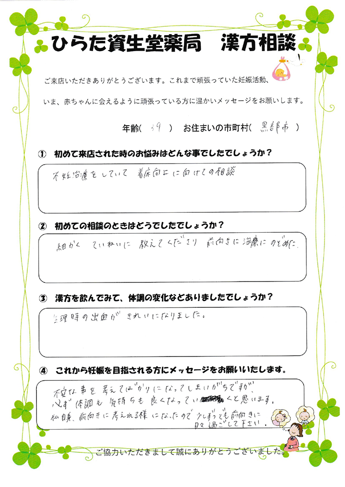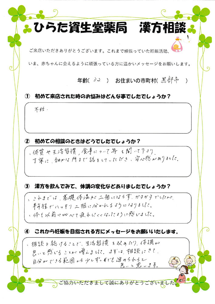 こちらに相談に来た時は先が全く見えず不安でしたが、通い始めて少しずつ体質が変わっていき無事妊娠できた事を嬉しく思っています。